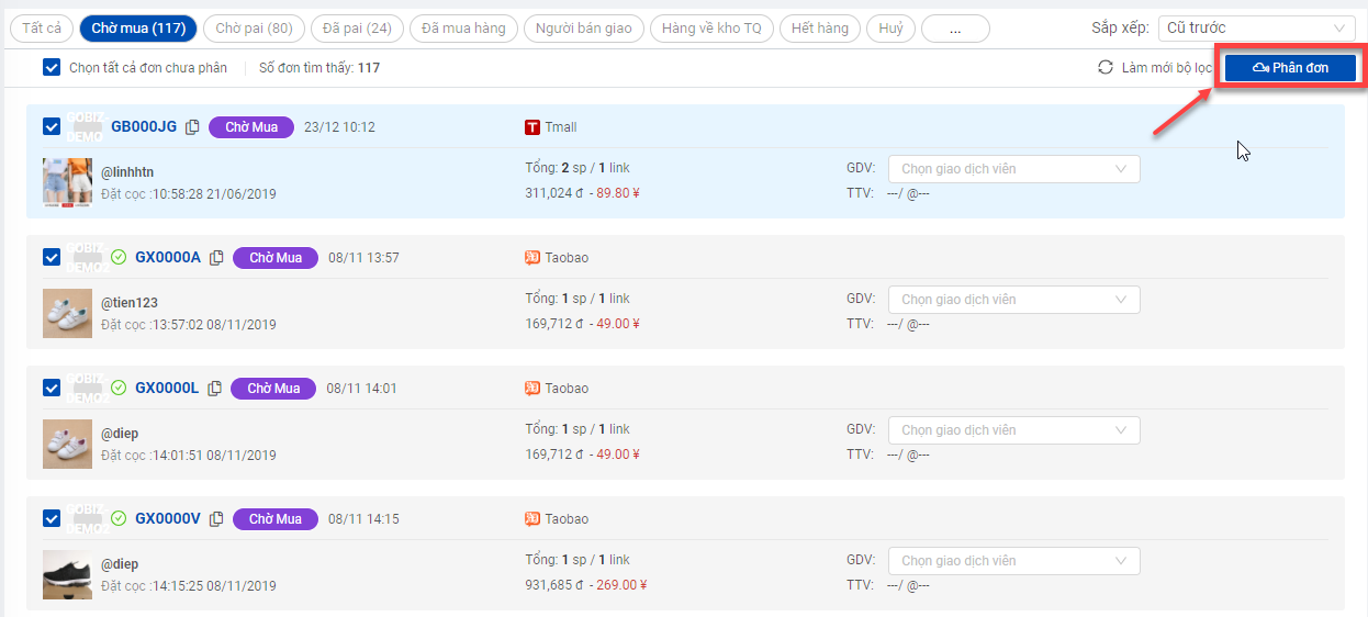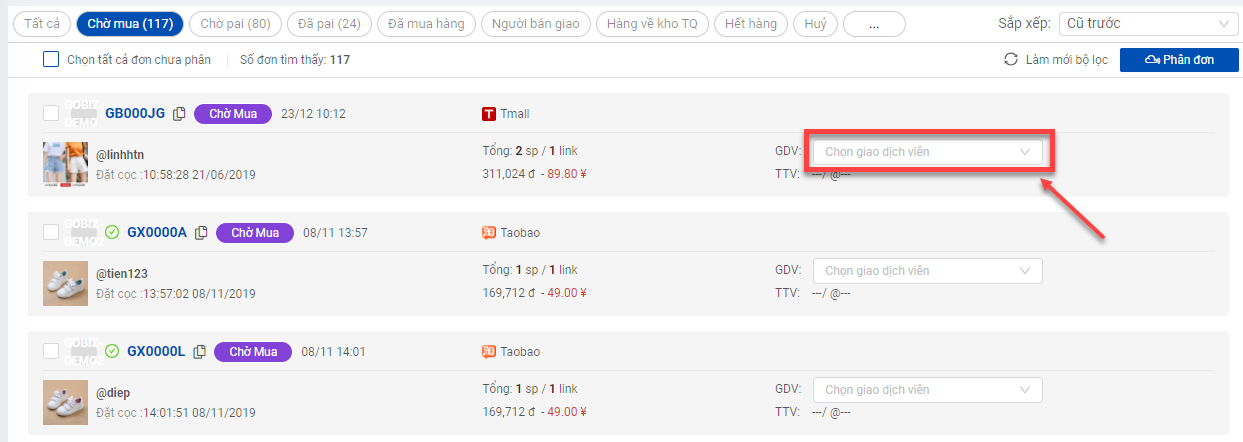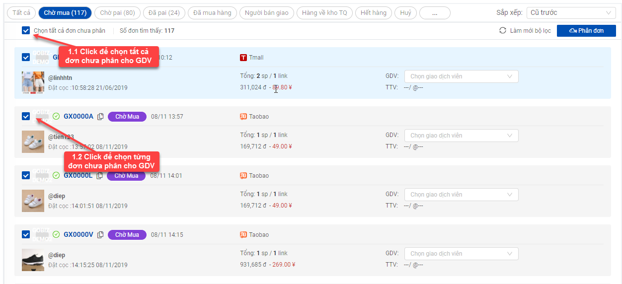 Bước 2: Thao tác phân nhiều đơn hàng cùng lúc cho GDV
