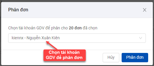2.3. Quản lý chọn tài khoản GDV để phân đơn và click Thực hiện để hoàn thành thao tác phân đơn.