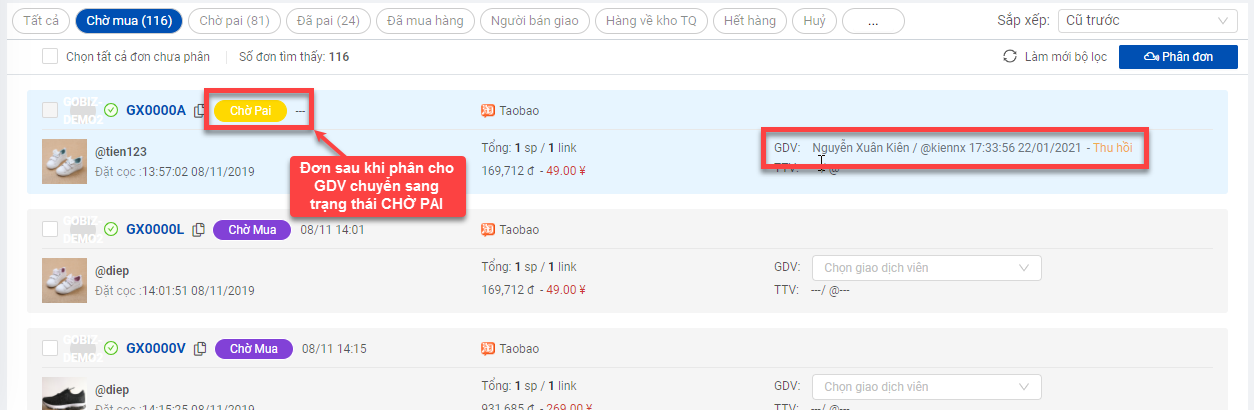 Bước 3: Thao tác phân từng đơn cho giao dịch viên