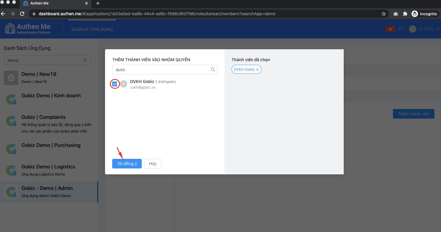 Quý khách chọn hệ thống cần phân quyền và thao tác thêm thành viên như hình minh họa: