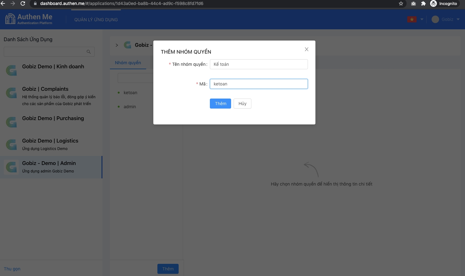 Điền tên Nhóm quyền và Mã nhóm quyền (Viết liền không dấu) -> Chọn Thêm