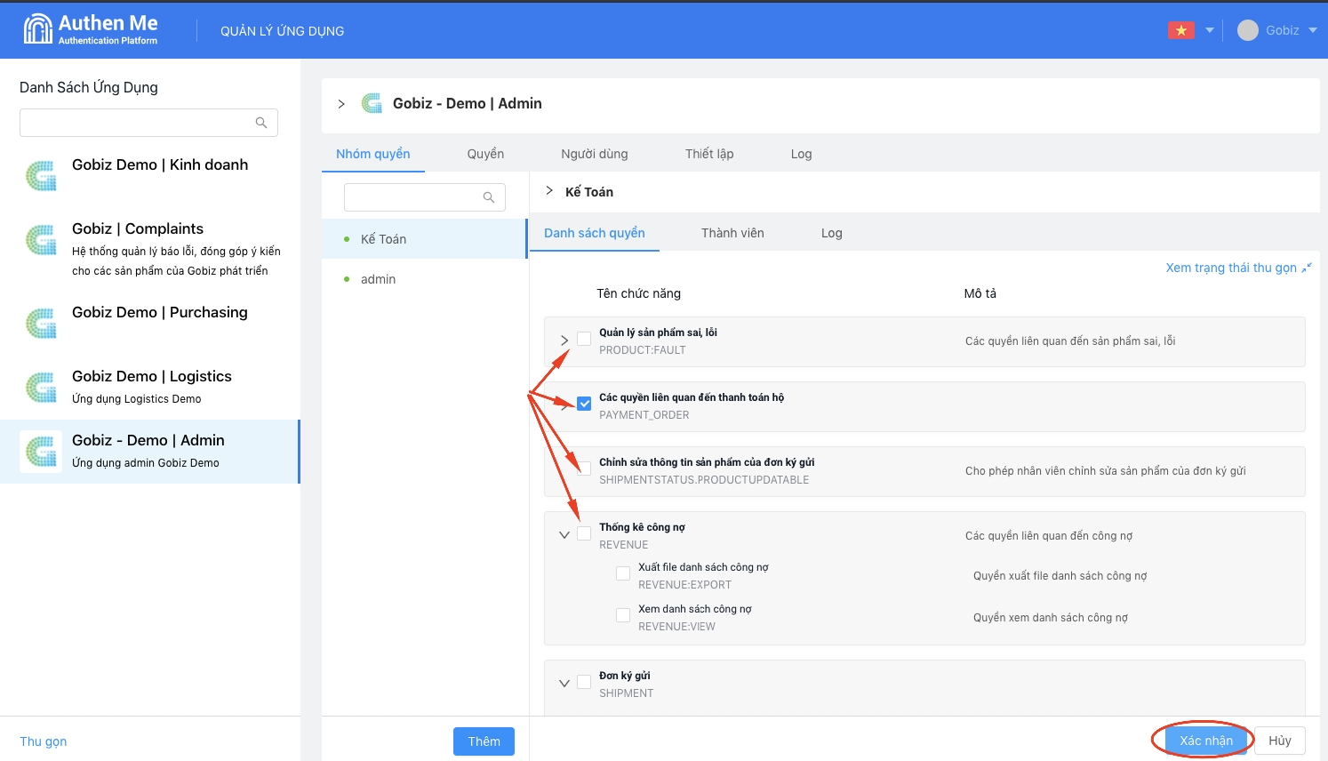 Tick chọn các quyền tương ứng với vị trí công việc/phòng ban -> Chọn Xác nhận