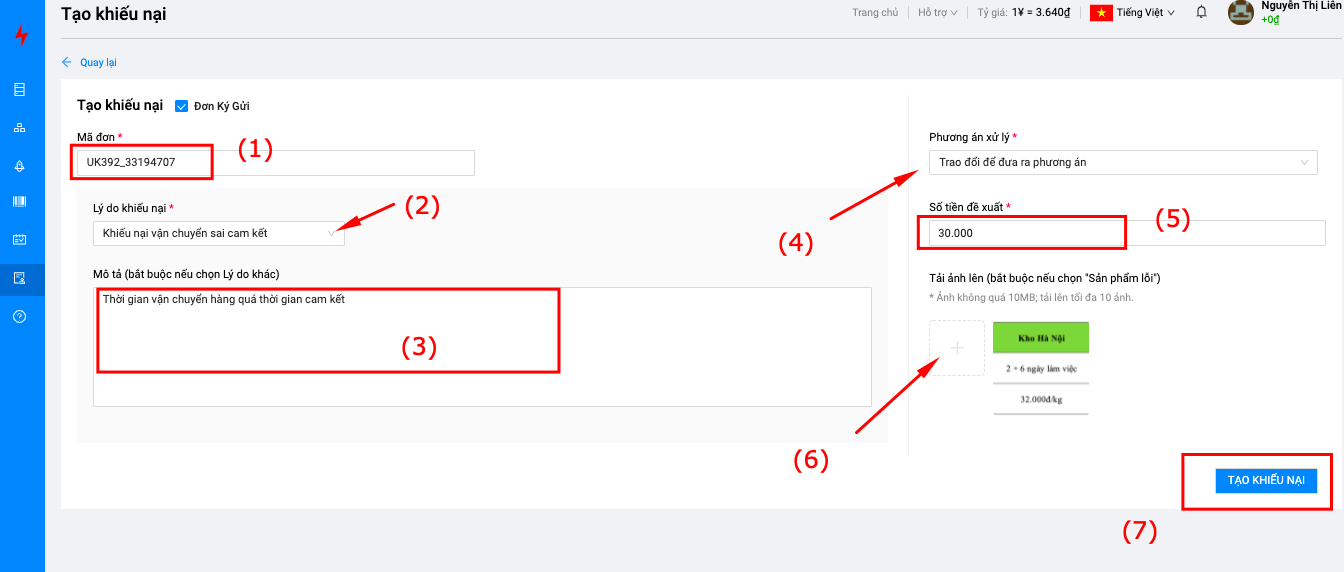 Bước 3: Mã đơn khiếu nại sẽ được điền tự động (1) -> Chọn lý do khiếu nại (2) -> Mô tả nội dung khiếu nại (3) -> Chọn phương án xử lý (4) => Đề xuất số tiền (5) => Up ảnh lên Khiếu nại (6) -> Bấm nút "Tạo khiếu nại" (7).![]()