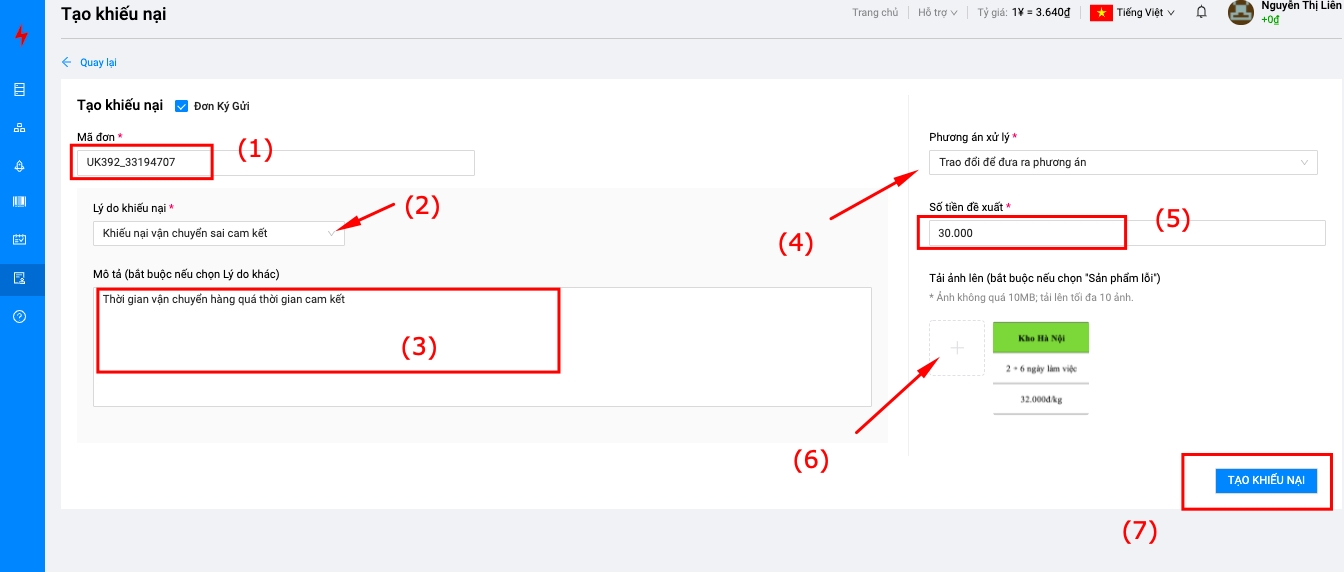 Bước 3: Mã đơn khiếu nại sẽ được điền tự động (1) -> Chọn lý do khiếu nại (2) -> Mô tả nội dung khiếu nại (3) -> Chọn phương án xử lý (4) => Đề xuất số tiền (5) => Up ảnh lên Khiếu nại (6) -> Bấm nút "Tạo khiếu nại" (7).