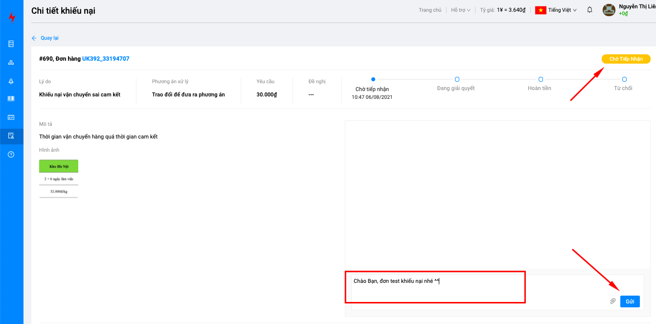Sau khi bấm "Tạo khiếu nại", hệ thống sẽ có thông báo tạo khiếu nại thành công và trạng thái "Chờ tiếp nhận". Ngoài ra Quý khách có thể bổ sung/trao đổi thêm các thông tin tại khung comment như hình: