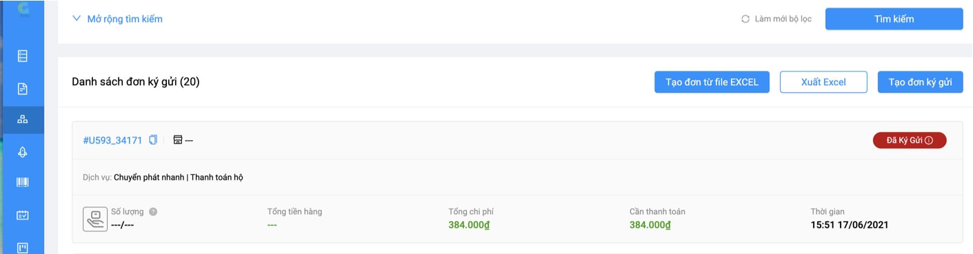 Đơn hàng tạo thành công sẽ ở trạng thái Đã ký gửi như hình:
