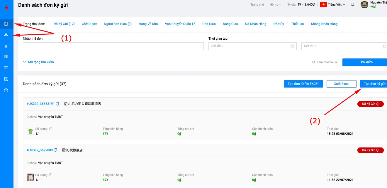 Bước 1: Từ bảng chung hoặc giao diện quản lý đơn hàng (1) -> chọn Tạo đơn ký gửi (2)