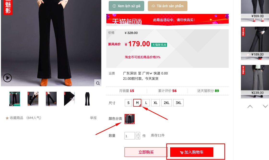Bước 2: Mở link sản phẩm cần mua -> Chọn thông tin sản phẩm (1) -> Thêm sản phẩm vào giỏ hàng (2).