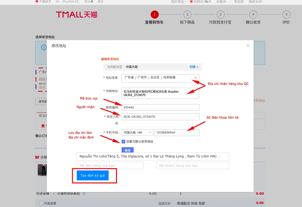 - Người nhận hàng/收货人:Tên user + mã đơn hàng (mã đơn hệ thống tự điền)