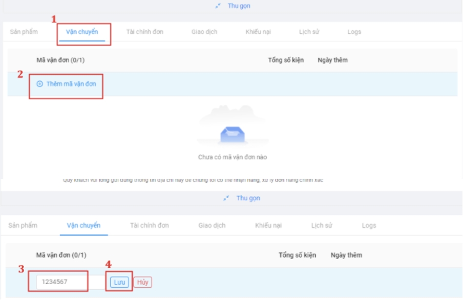 Chọn đơn hàng cần khớp MVĐ -> Chọn tab Vận chuyển (1) -> Thêm mã vận đơn (2) -> Điền mã vận đơn (3) -> Bấm Lưu (4).