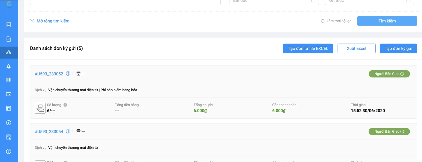 Áp dụng đối với các trường hợp ký gửi hàng hoá không cần tạo đơn hàng