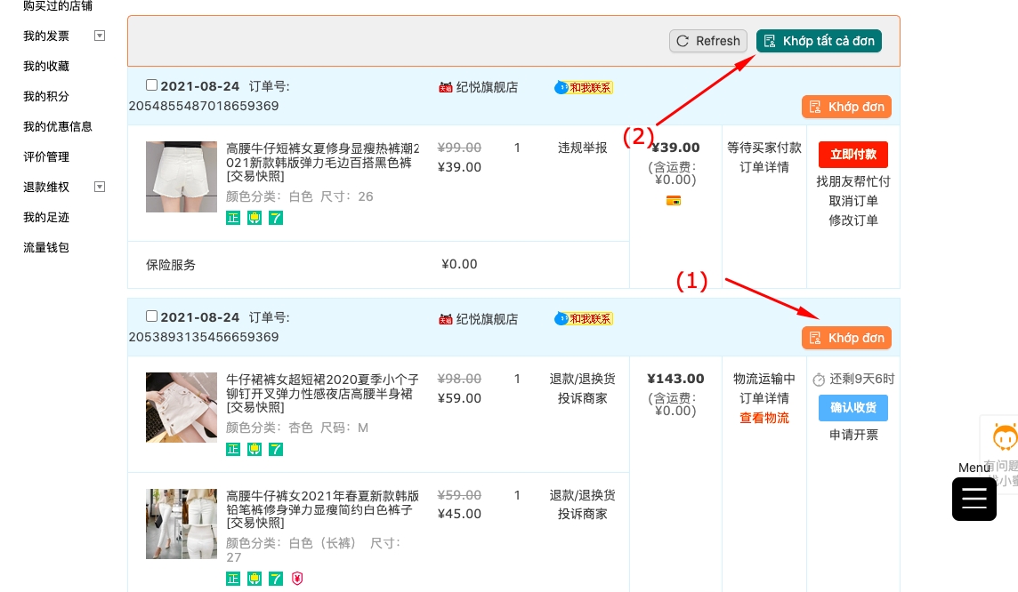 Bước 1: Mở danh sách đơn trong mục Quản lý đơn hàng 我的淘宝 -> 已买到的宝贝.