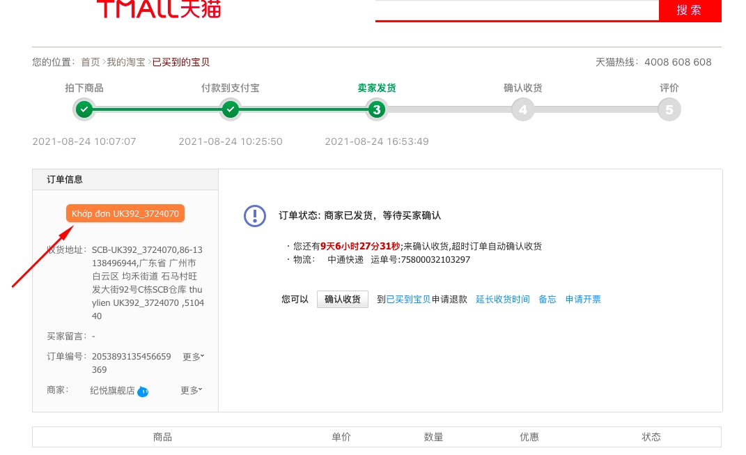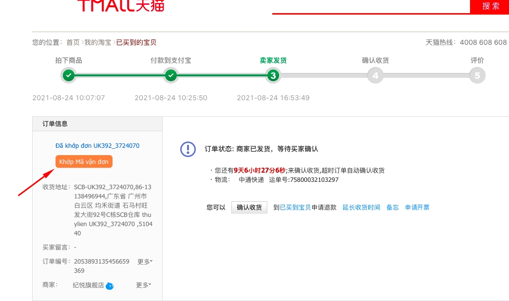 Đã khớp đơn: Kho Trung Quốc đã tạo đơn hàng tương ứng với MVĐ nhận được.