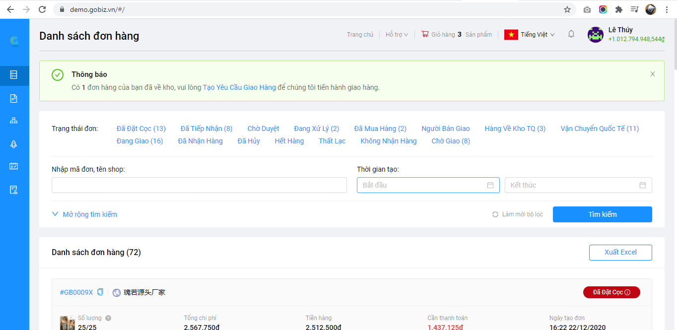 Sau khi hàng về và được nhập kho Việt Nam, hệ thống sẽ hiển thịthông báo kèm đường dẫn tạo yêu cầu giao hàng. Thông báo sẽ hiển thị cho đến khi Quý khách tăt đi, tạo yêu cầu giao hoặc đơn hàng được xuất kho Việt Nam.