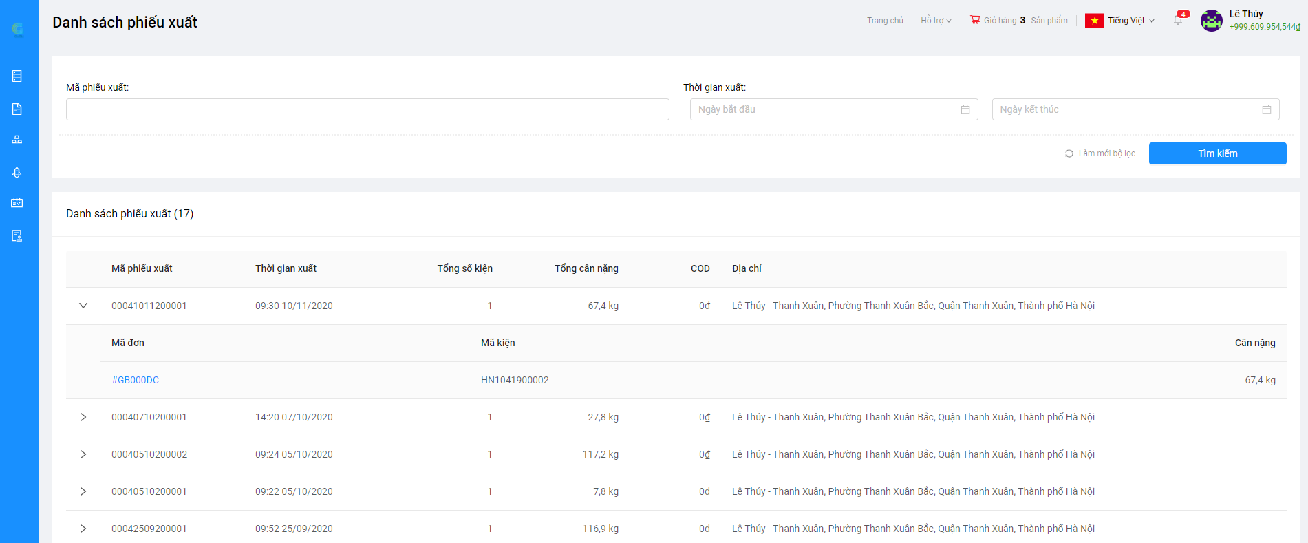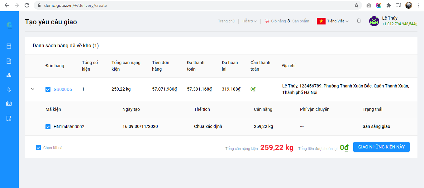 Sau khi chọn vào Tạo yêu cầu giao sẽ hiển thị ra màn hình danh sách các kiện hàng sẵn sàng giao, kèm cân nặng, tài chính và địa chỉ nhận hàng.