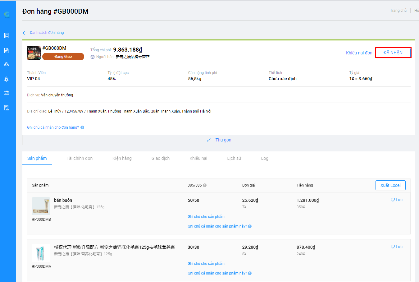 Để hoàn tất đơn hàng, Quý khách truy cập vào chi tiết đơn hàng ở trạng thái Đang giao click vào Đã nhận.