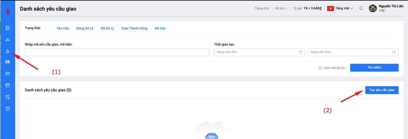 Bước 1: Đăng nhập tài khoản -> chọn mục Giao hàng (1) -> Tạo yêu cầu giao hàng (2) như hình: