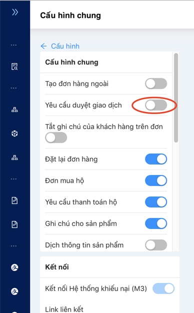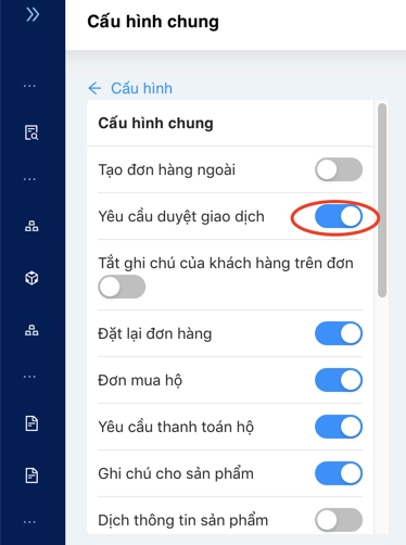 Khi chọn BẬT và Lưu cấu hình, giao dịch tài chính được tạo sẽ chuyển vào menu Danh sách giao dịch yêu cầu