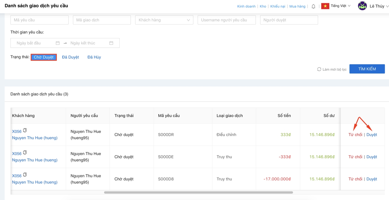 Admin có quyền duyệt hoặc từ chối giao dịch yêu cầu: