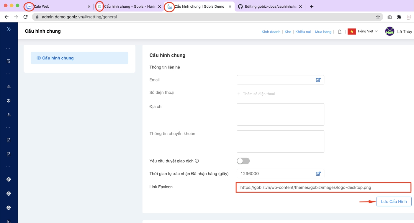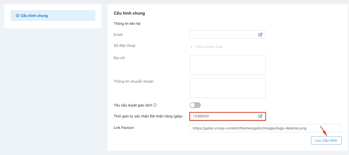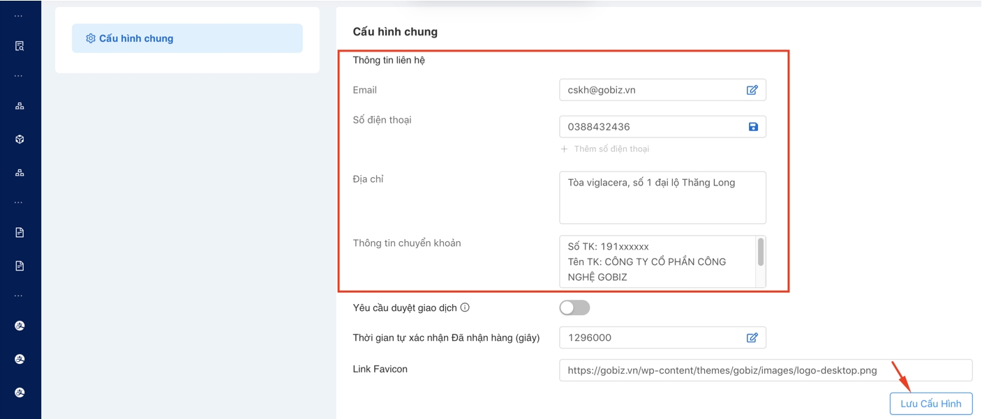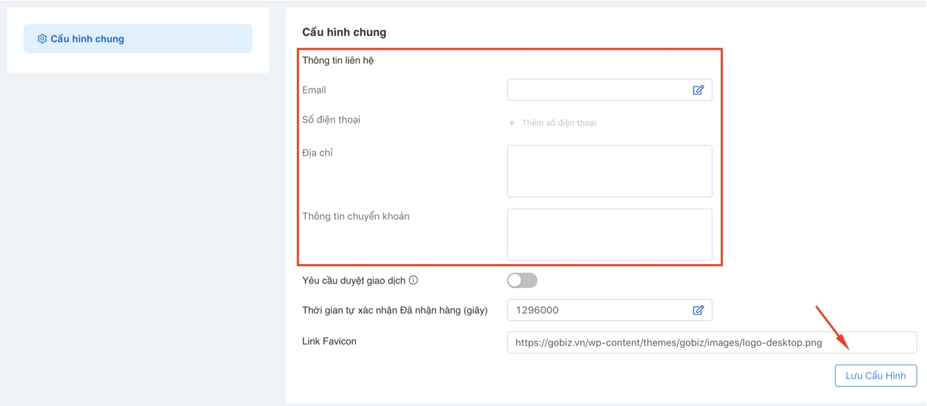 Tại màn hình Cấu hình chung, Quý khách cấu hình Favicon hiển thị trên giao diện khách hàng bằng cách thêm link ảnh (bắt buộc phải là url), sau đó Lưu cấu hình.