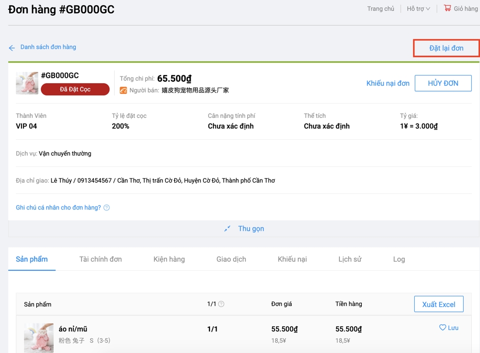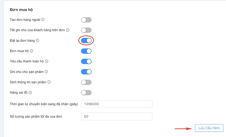 Khi chọn BẬT và Lưu cấu hình, tại giao diện chi tiết đơn hàng sẽ xuất hiện button Đặt lại đơn