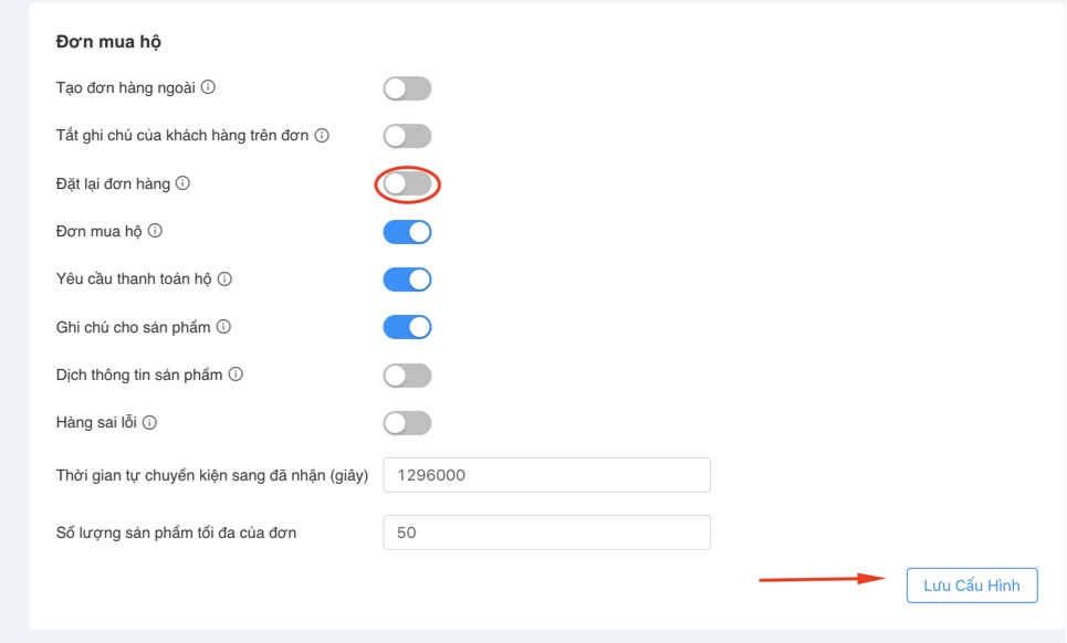 Khi chọn TẮT và Lưu cấu hình, tại giao diện chi tiết đơn hàng button Đặt lại đơn sẽ không được hiển thị.