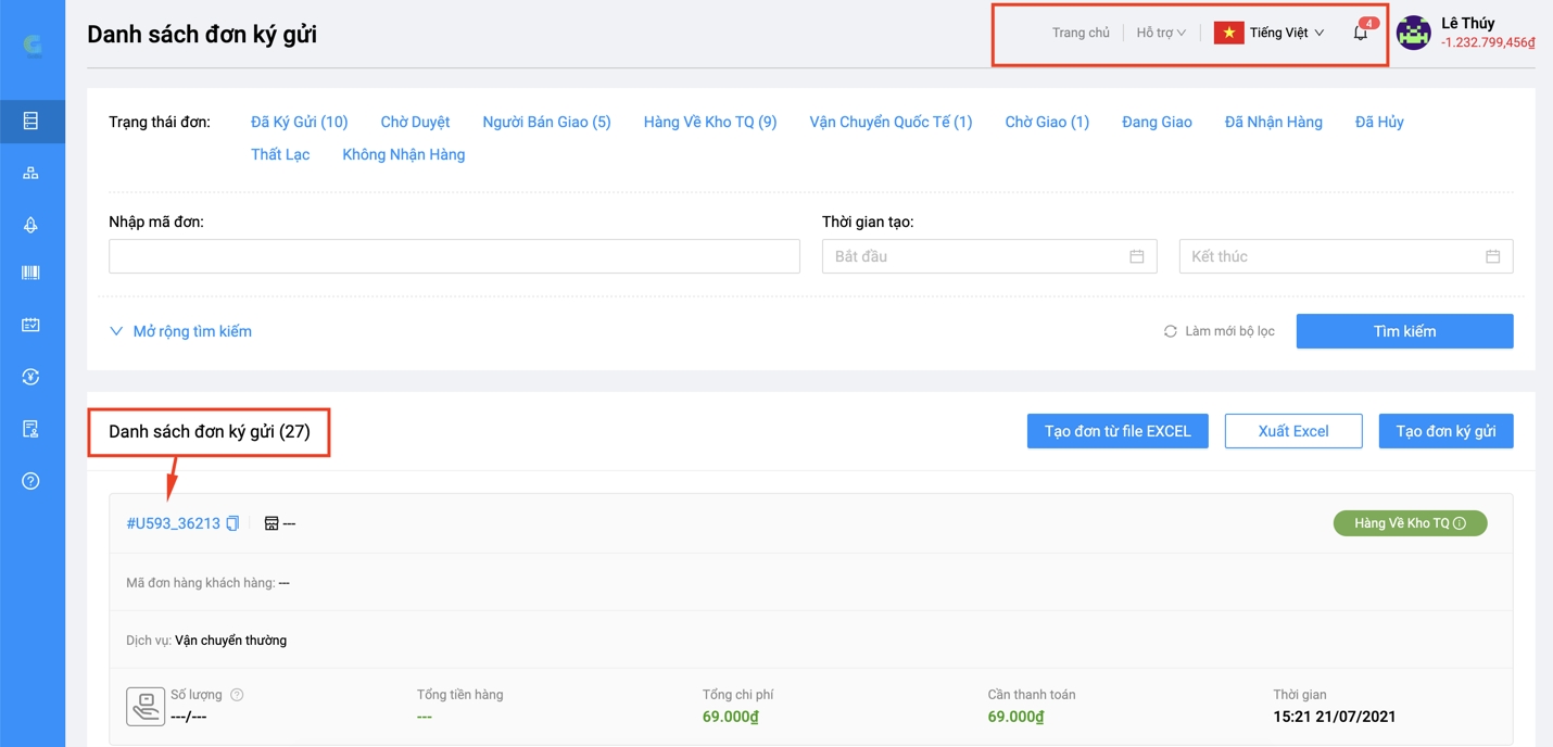 Khi chọn TẮT và Lưu cấu hình, tại giao diện của khách chỉ xuất hiện danh sách đơn ký gửi.