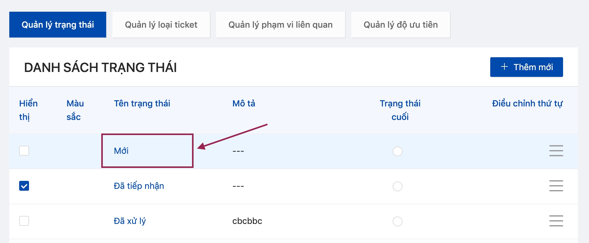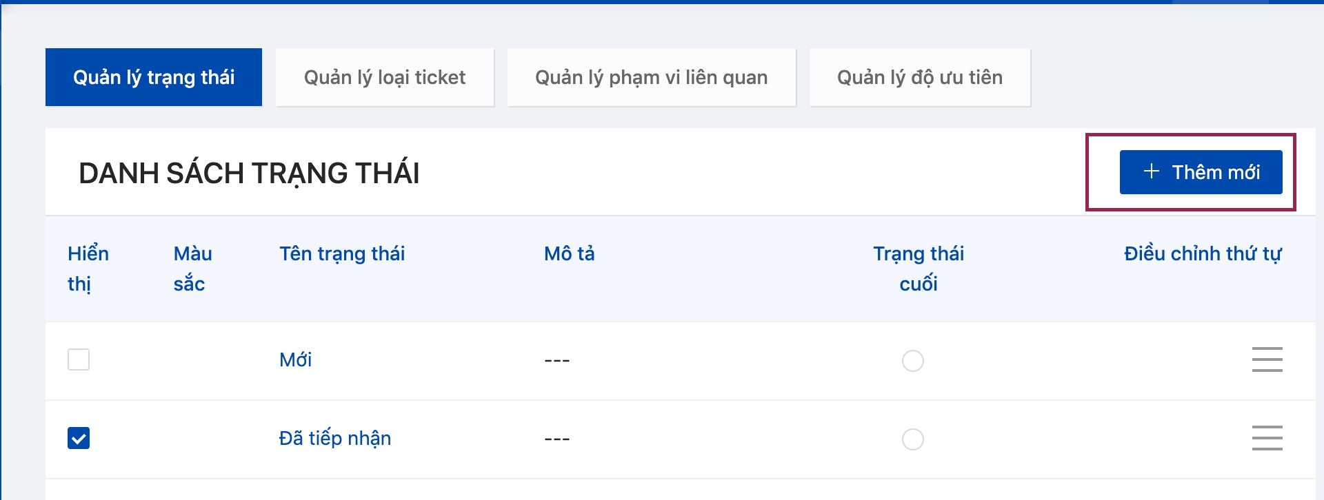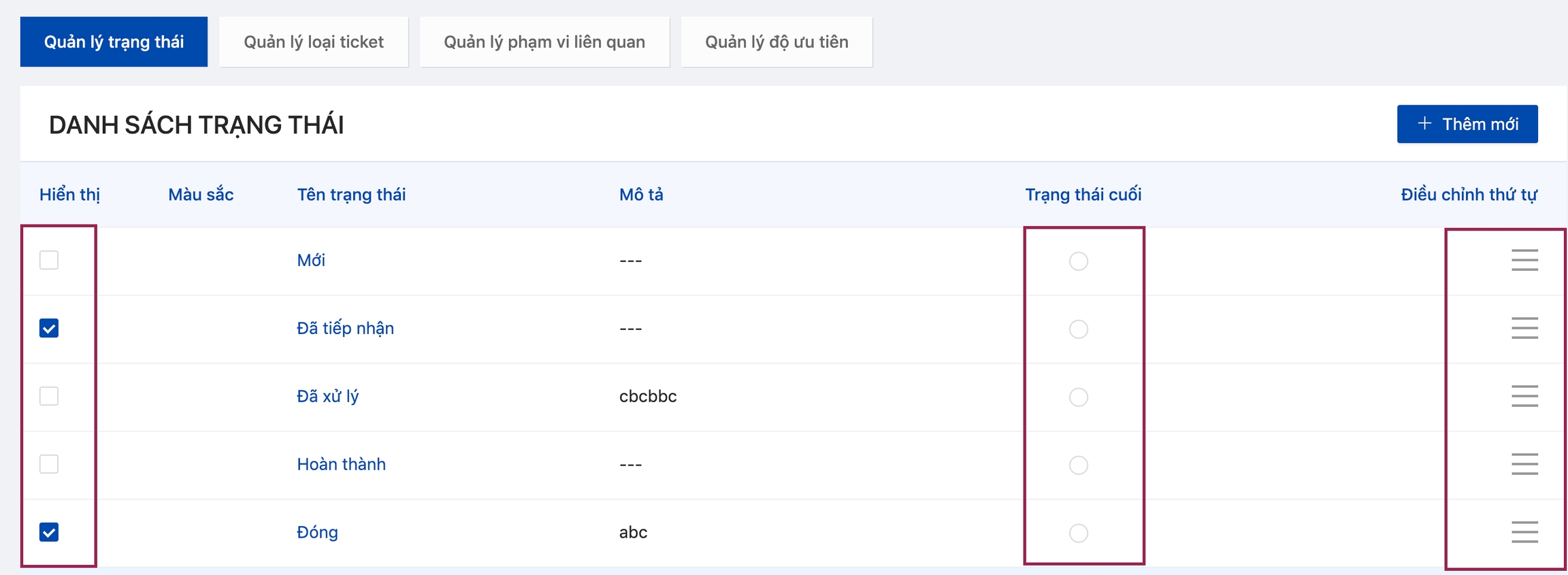 Điều chỉnh thứ tự hiển thị trạng thái. Khi điều chỉnh thì các mục liên quan như: trường trạng thái khi cập nhật ticket, Danh sách ticket dạng Kanban cũng sẽ sắp xếp lại theo thứ tự này