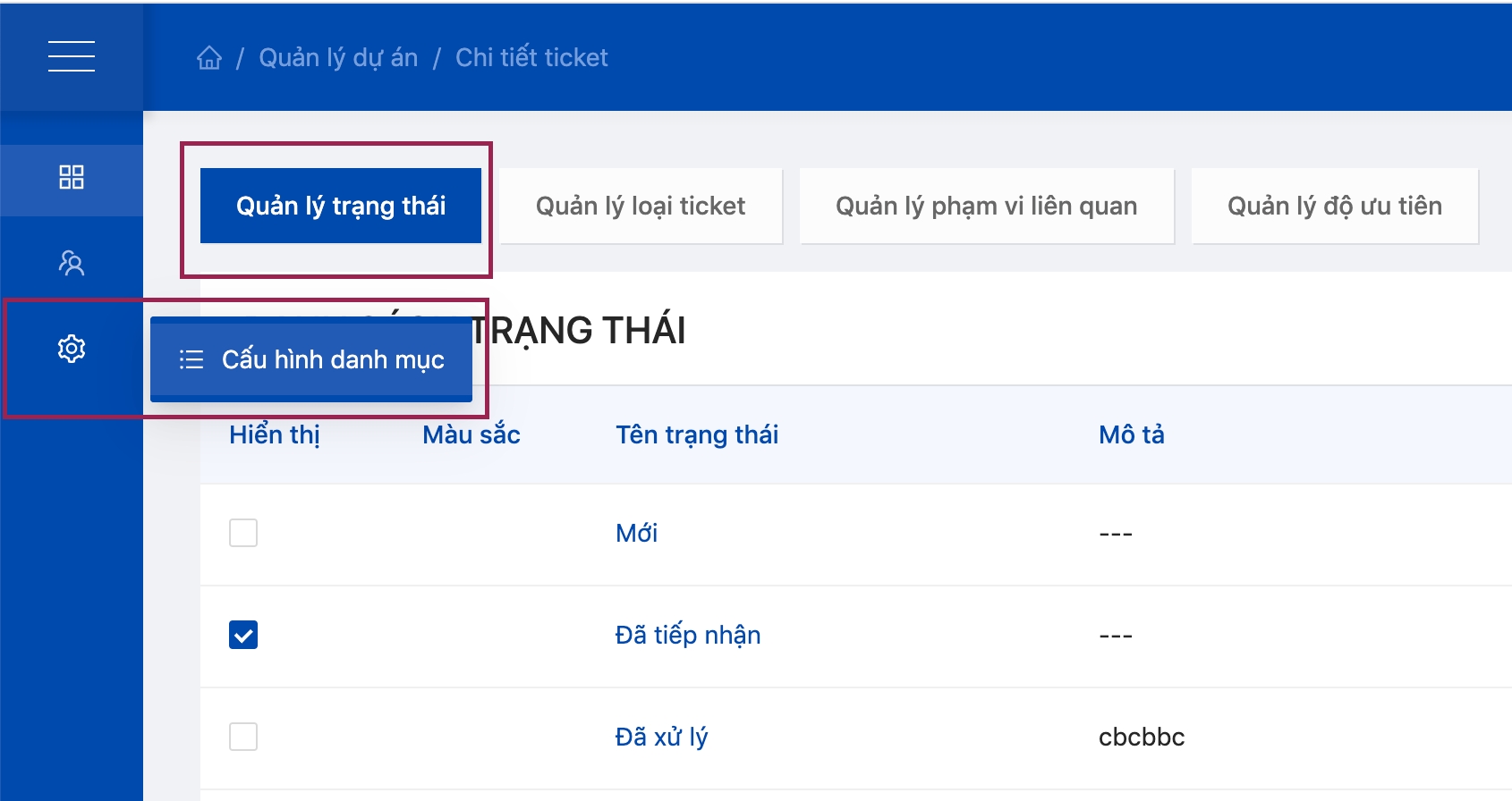Bước 4: Người dùng cũng có thể cập nhật các ticket đã tồn tại bằng cách bấm vào Tên của trạng thái muốn chỉnh sửa và chỉnh sửa lại các thông tin