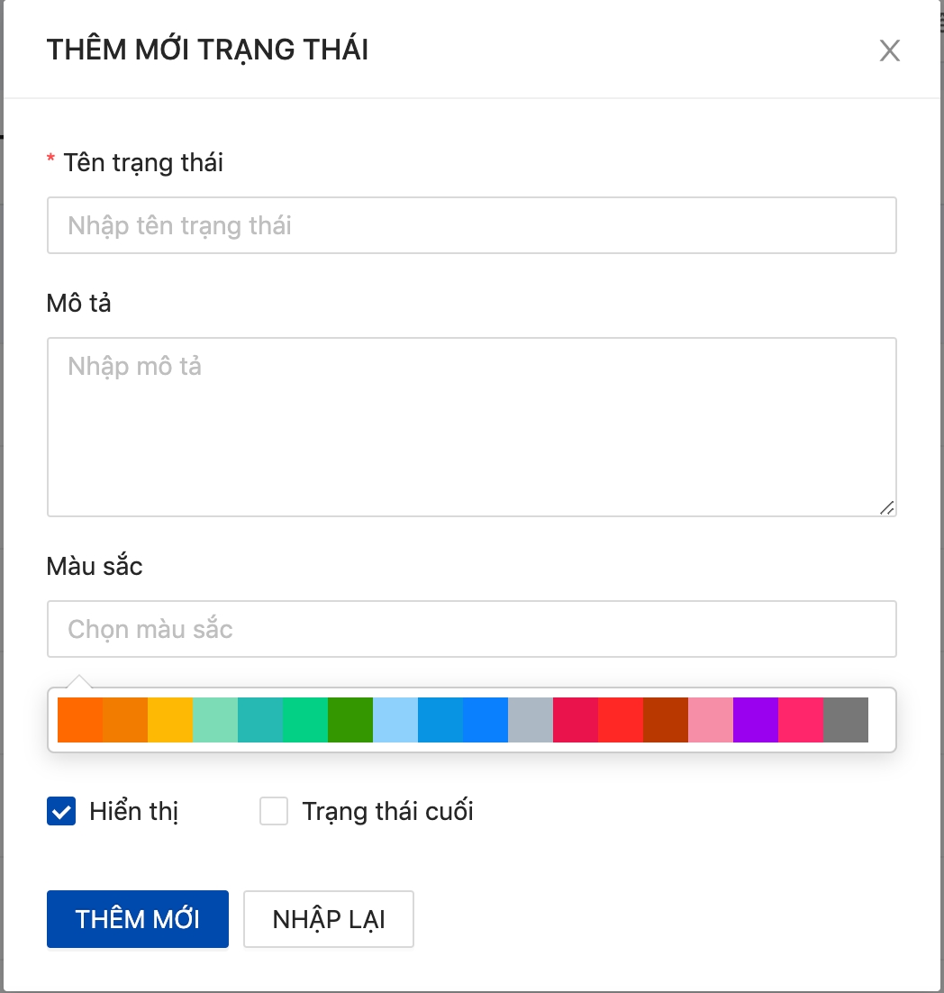 Bước 3: Người dùng có thể tạo mới thêm 1 trạng thái trong hệ thống bằng cách bấm chọn "Thêm mới". Hệ thống hiển thị giao diện để người dùng nhập các thông tin của trạng thái mới, trong đó Tên trạng thái là bắt buộc nhập. Người dùng có thể thiết lập màu sắc của trạng thái để phân biệt các ticket có trạng thái khác nhau ở trang Danh sách ticket