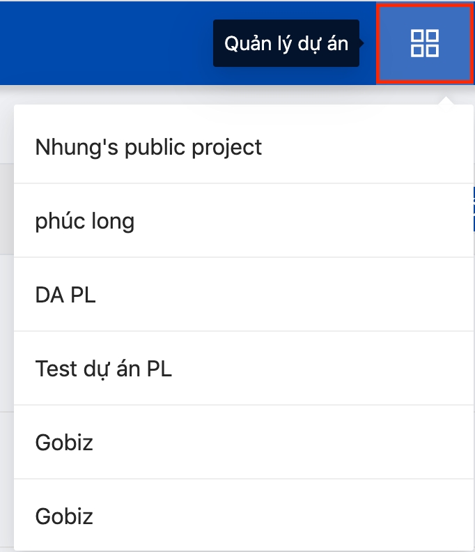 Bước 3: Người dùng có thể chuyển dự án nhanh mà không cần phải vào menu Quản lý dự án bằng cách vào icon Quản lý dự án, hệ thống hiển thị ra các dự án hiện tại người dùng đang là thành viên, người dùng có thể chọn để truy cập vào dự án luôn