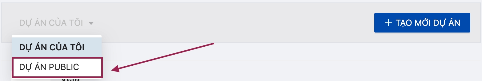 Ngoài ra người dùng cũng có thể xem Danh sách dự án Public (những dự án cho phép người dùng không là thành viên vẫn có quyền xem với vai trò của Khách) bằng cách bấm chọn sang Dự án Public