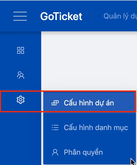 Bước 1: Người dùng bấm vào biểu tượng tại menu dọc, chọn Cài đặt/Cấu hình dự án