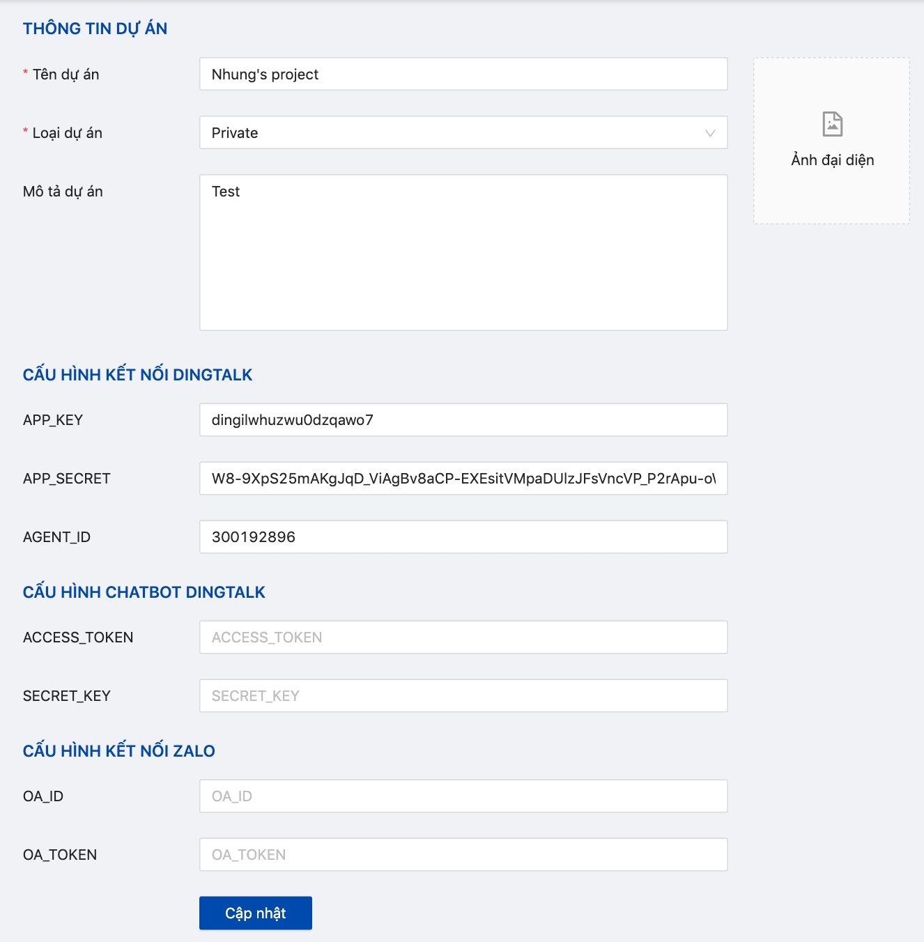 Cập nhật thông tin dự án và cấu hình kết nối Dingtalk,Zalo