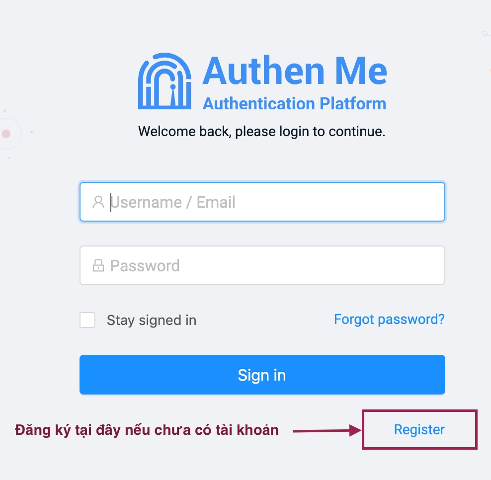 Bước 2: Nhập chính xác Tên đăng nhập và Mật khẩu đã đăng ký sau đó bấm nút “Sign in" để hệ thống kiểm tra. Trường hợp chưa đăng ký tài khoản, người dùng bấm nút "Register" để thực hiện đăng ký tài khoản trước khi đăng nhập vào hệ thống.