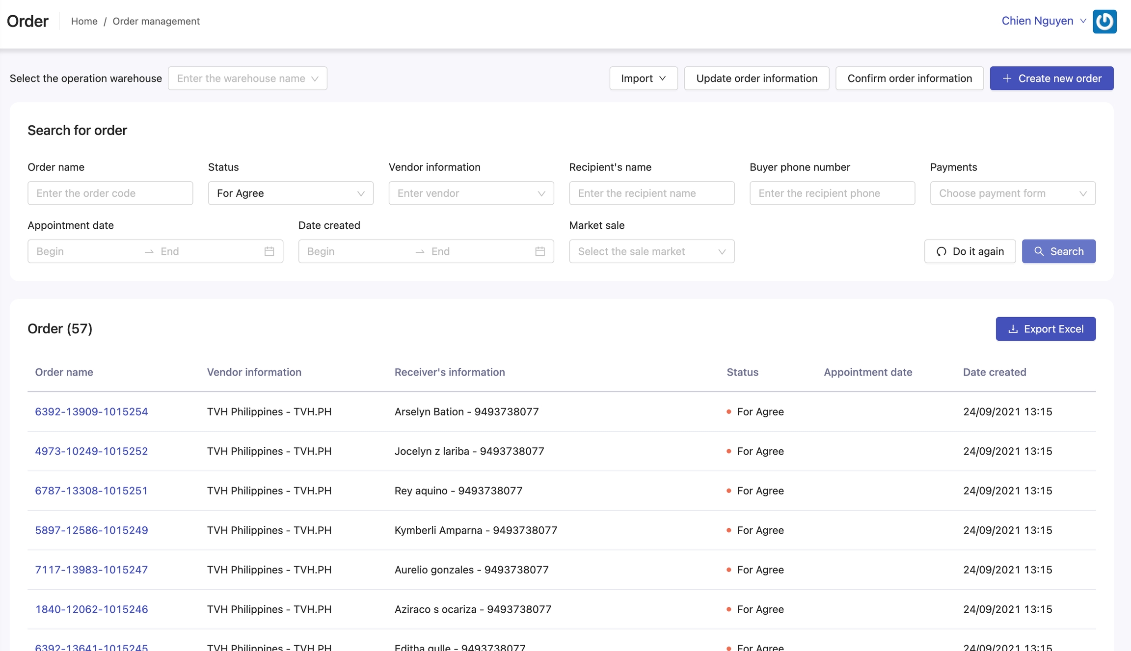 Step 1: Enter order list. Filter as per status "For Agree", other filters can be used as "Market", "Vendor" and "Warehouse"