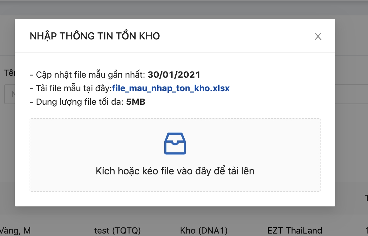Bước 2: Để nhập tồn kho, người dùng click button "tải file nhập tồn kho" và kéo file vào vùng tải lên.