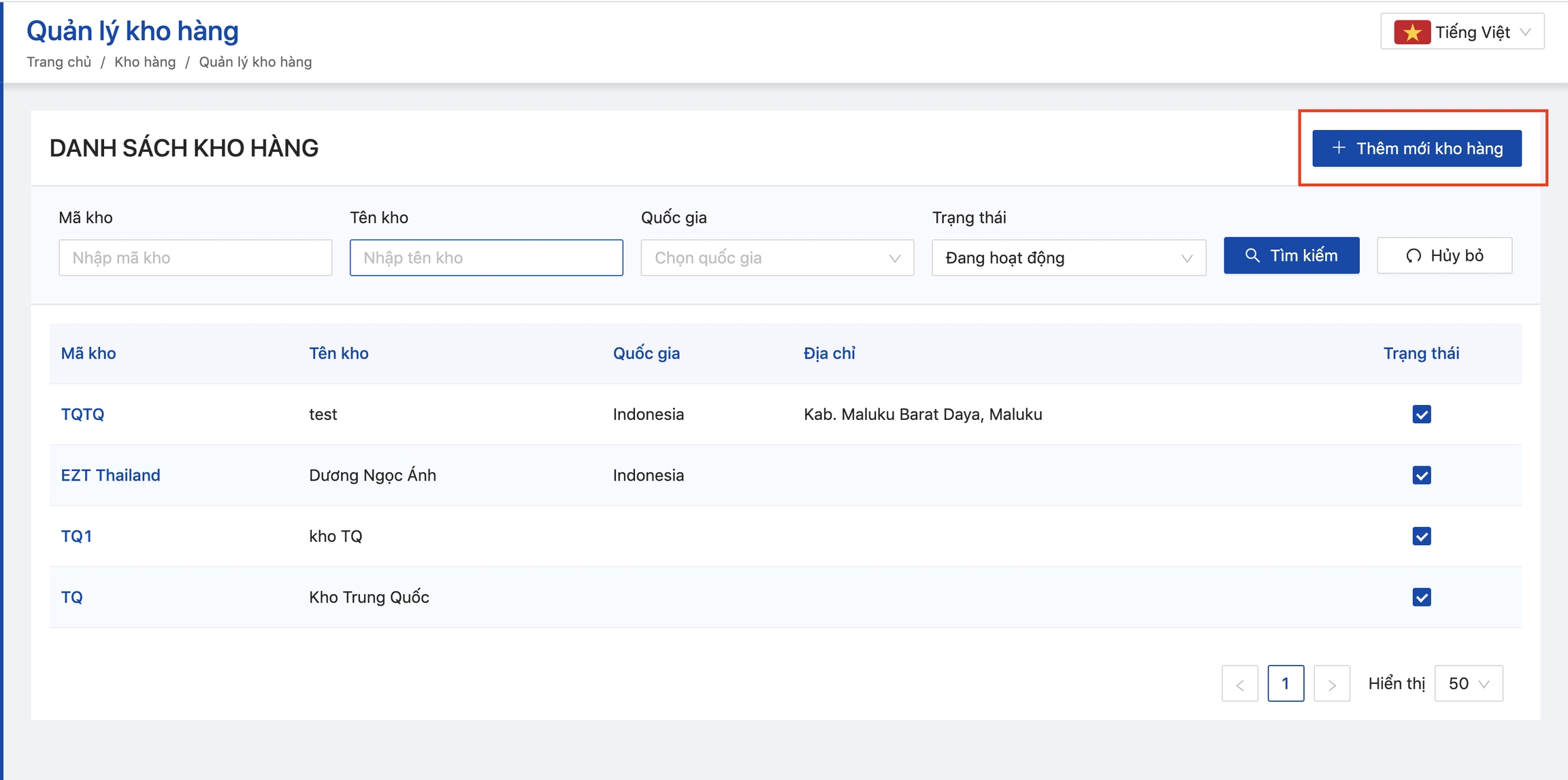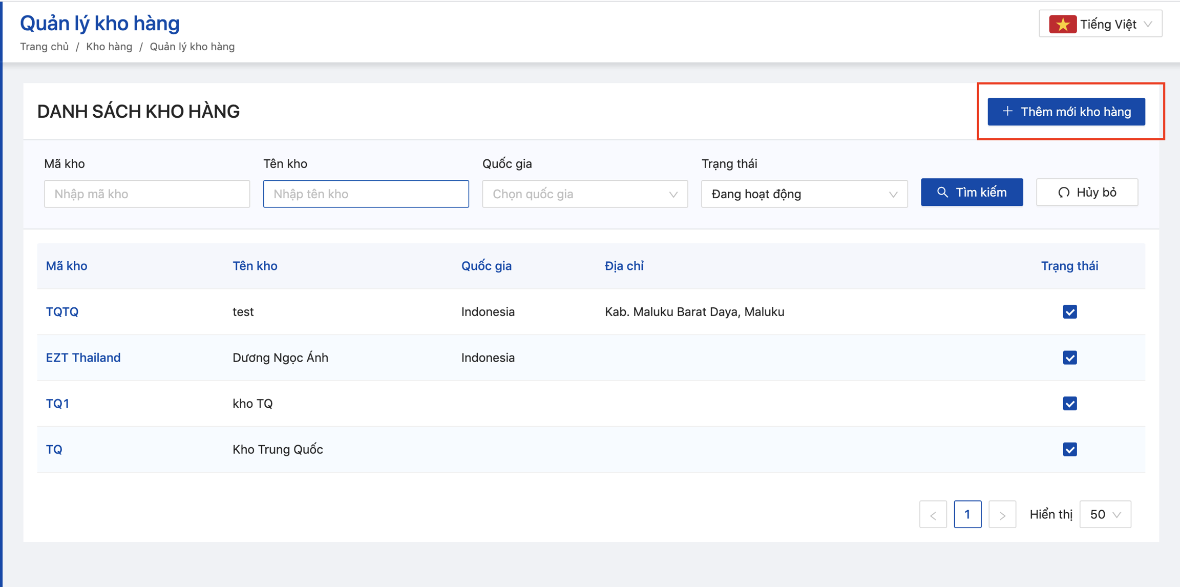 Bước 3: Người dùng xem và tìm kiếm kho hàng tại Danh sách kho hàng khi truy cập vào Menu Quản lý kho. Tại đây hệ thống hỗ trợ người dùng tìm kiếm và bộ lọc để dễ dàng tìm kiếm các kho