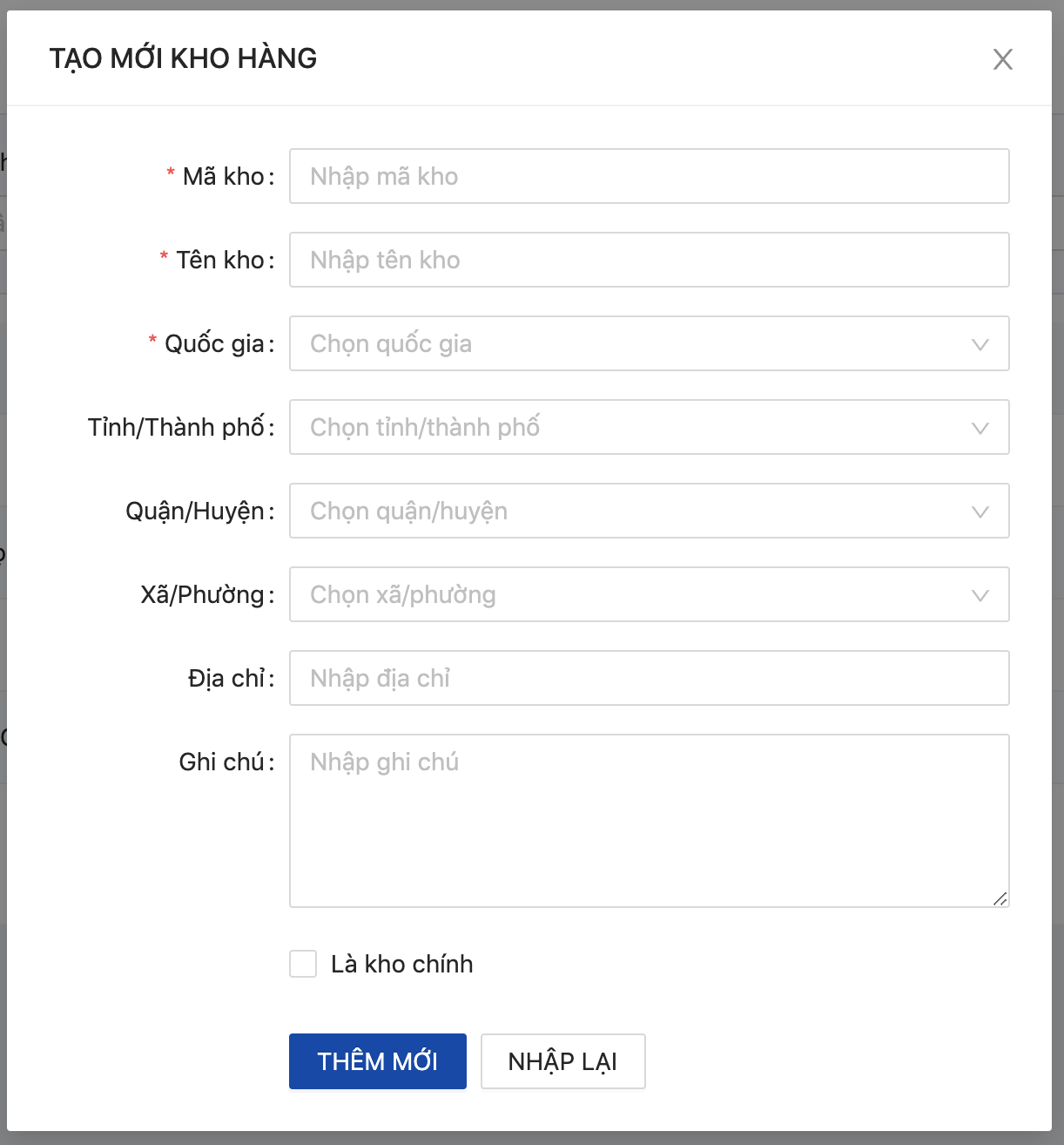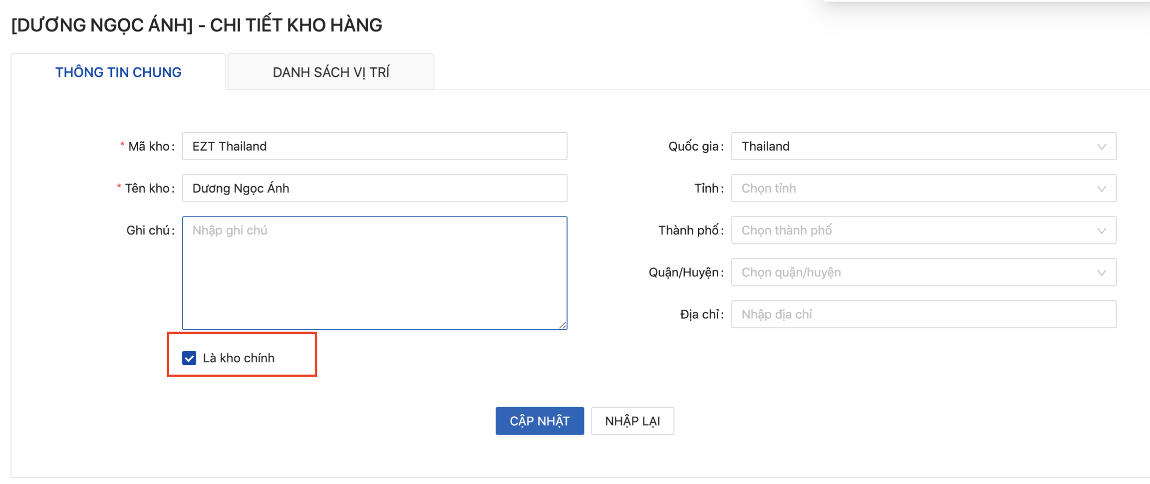 Bước 2: Người dùng nhập các thông tin của kho hàng. Các trường thông tin ( * ) là bắt buộc nhập. Có button check chọn để đánh dấu đó là Kho chính. 1 quốc gia chỉ được thiết lập 1 kho chính