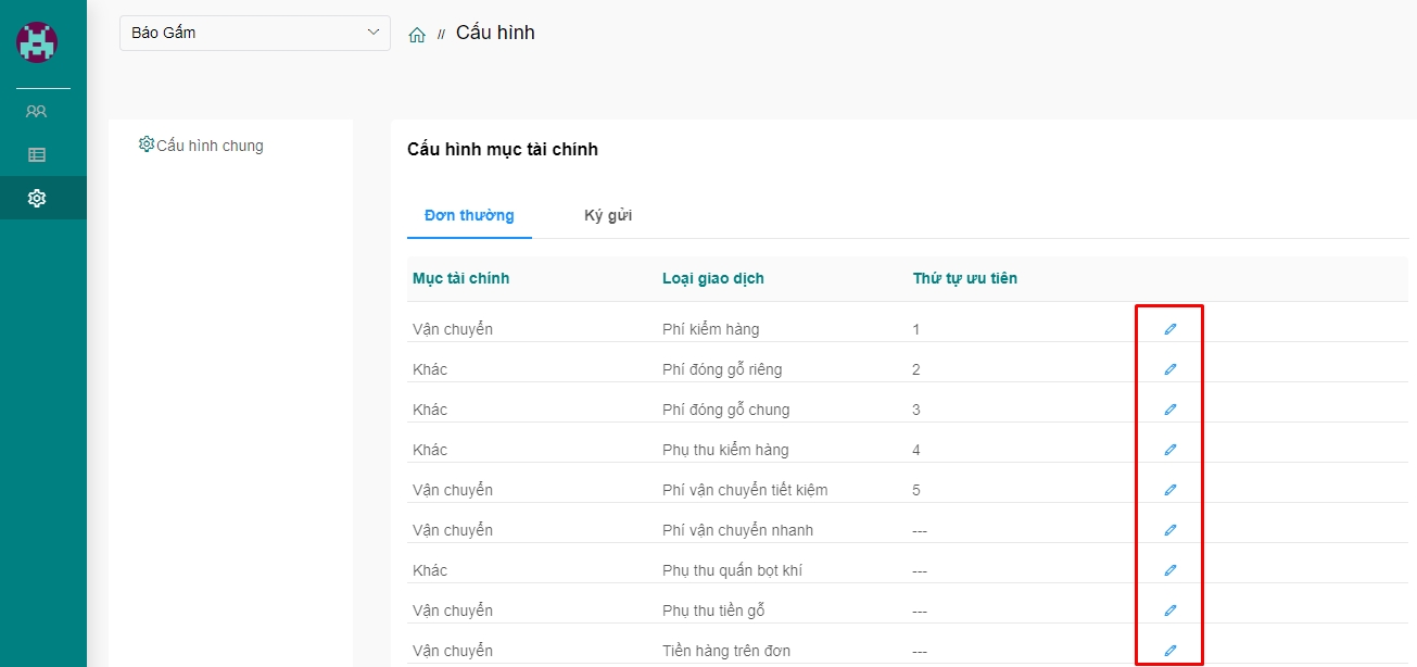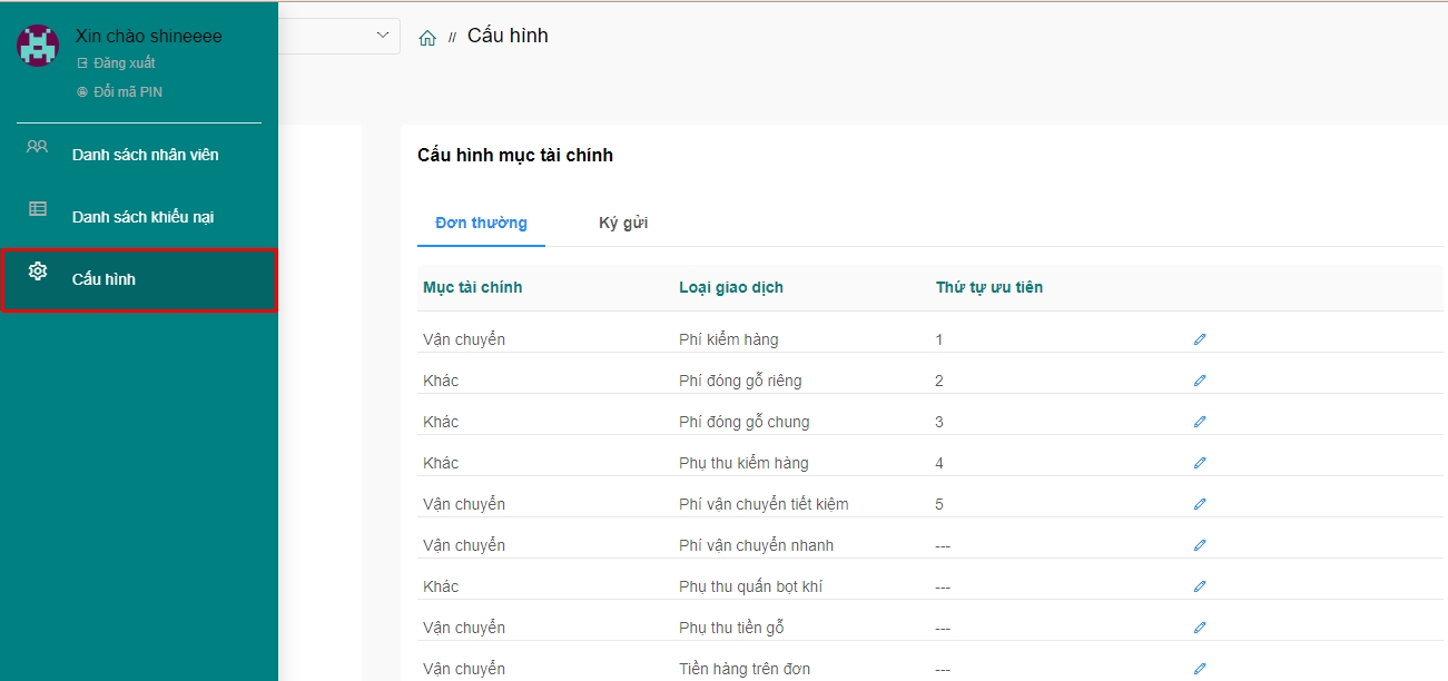Bước 2: Tại màn hình Cấu hình, quý khách chọn icon sửa tại mục tài chính cần thay đổi: