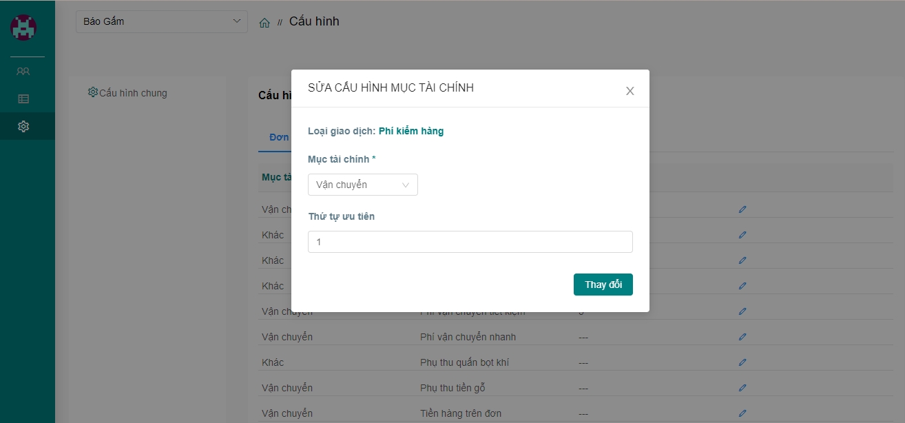 Sau thay đổi cấu hình mục tài chính thành công, hệ thống sẽ hiển thị thông báo "Thành công":