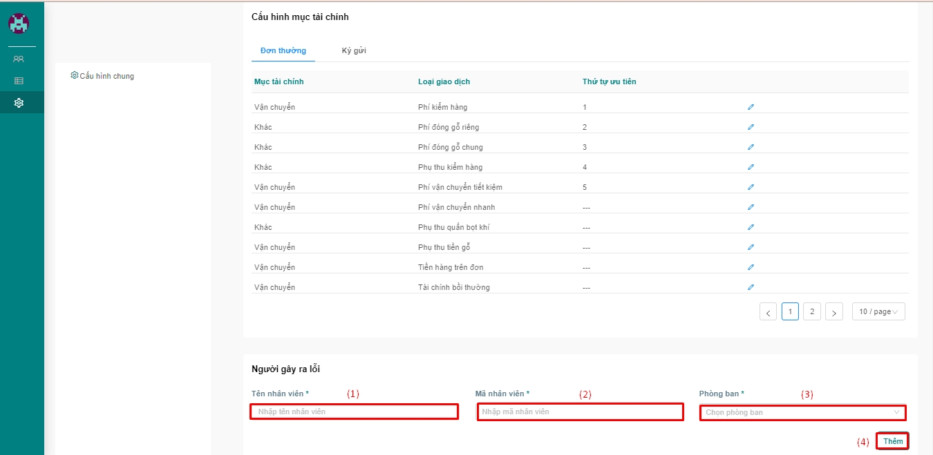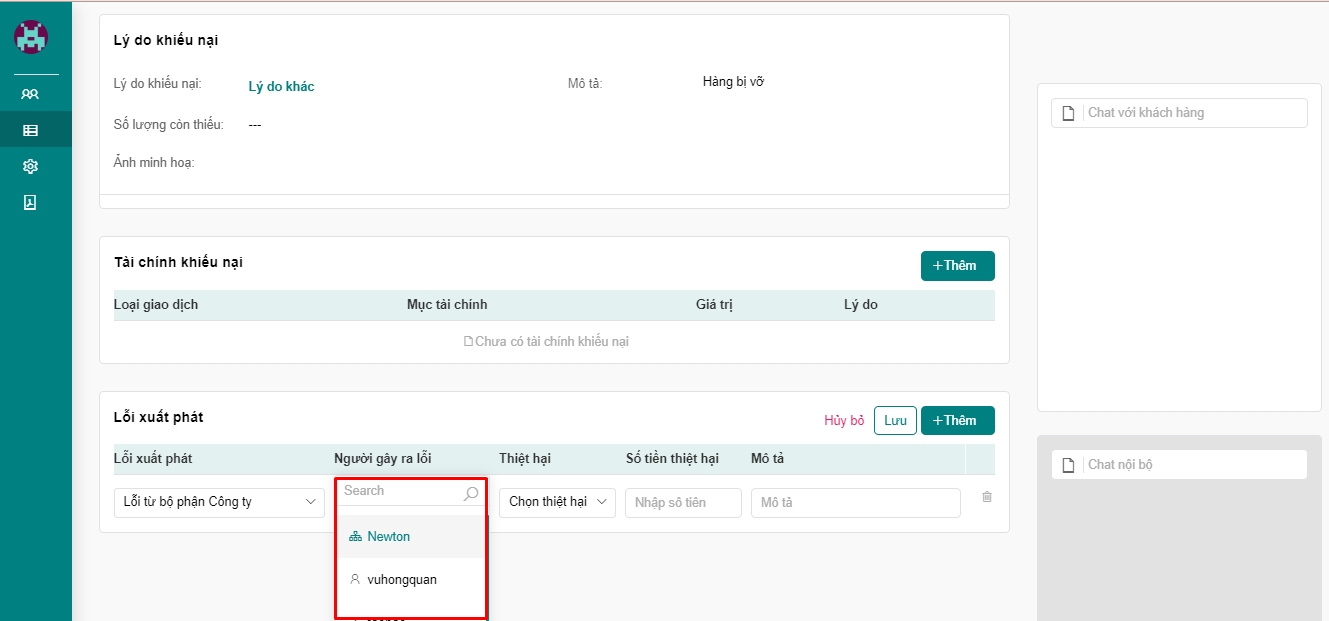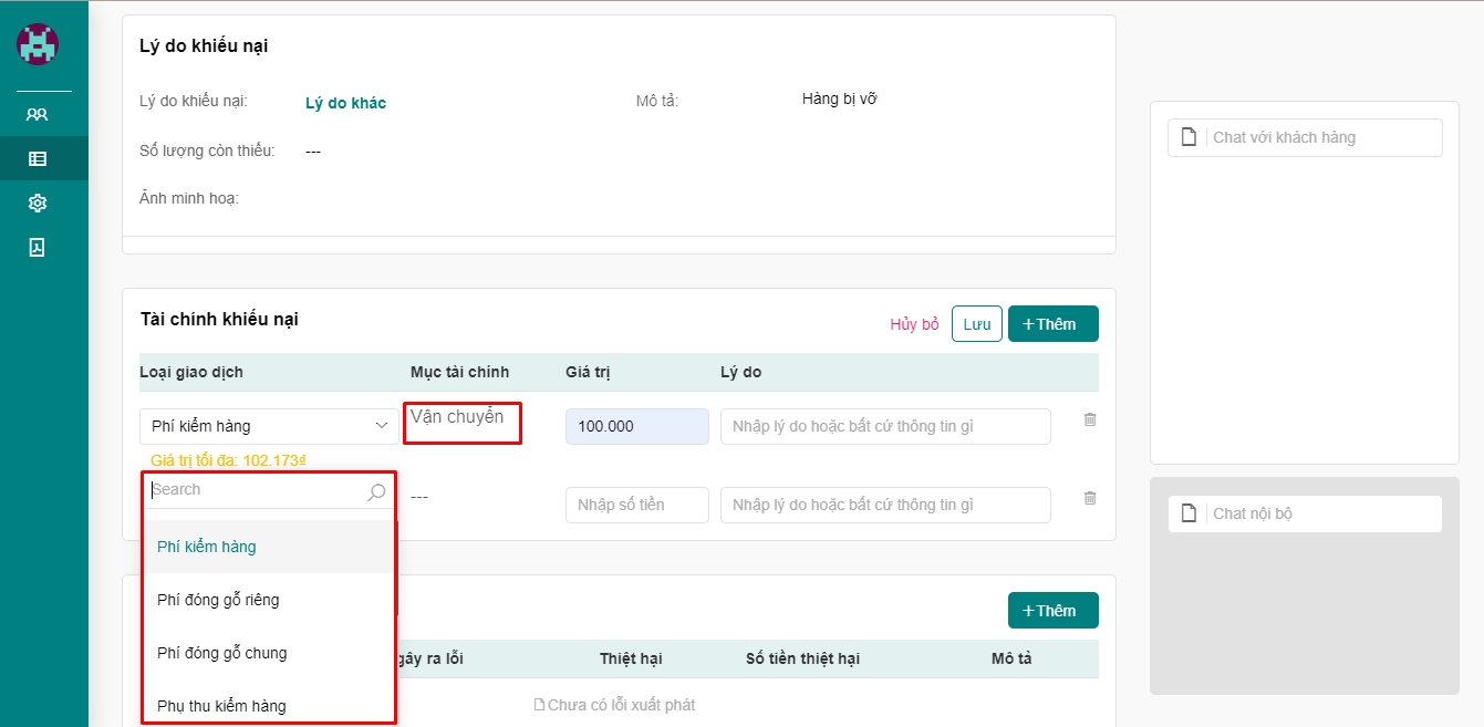 Mục đích: Chức năng này cho phép quý khách có thể quản lý mục tài chính trên đơn, chỉnh sửa mục tài chính và thêm thông tin người gây ra lỗi. Ngoài ra quý khách có thể cấu hình số tiền duyệt trên khiếu nại cho mỗi nhân viên.
