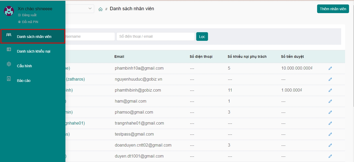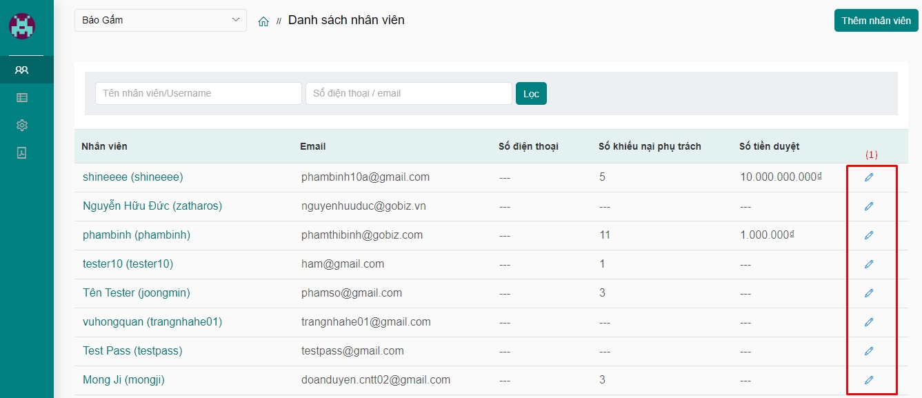 Bước 2: Tại màn hình Danh sách nhân viên, quý khách chọn (1) để cấu hình số tiền duyệt trên khiếu nại cho từng nhân viên: