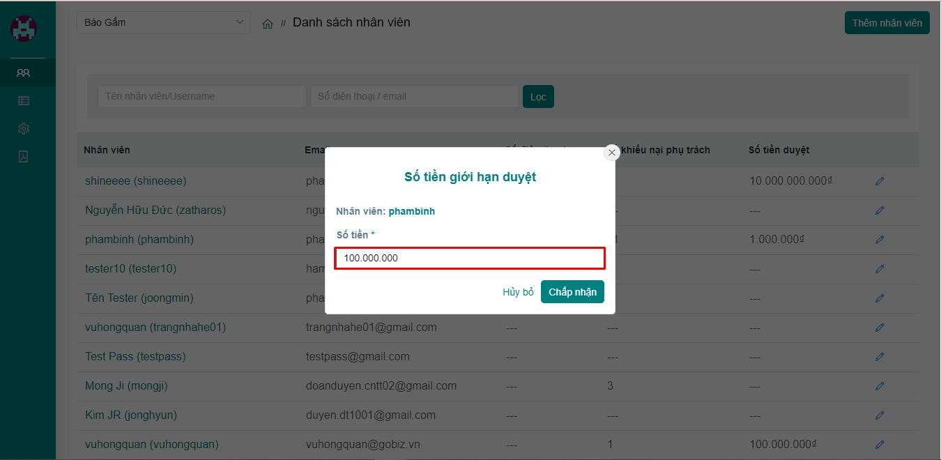 III. Cấu hình số tiền duyệt cho nhân viên