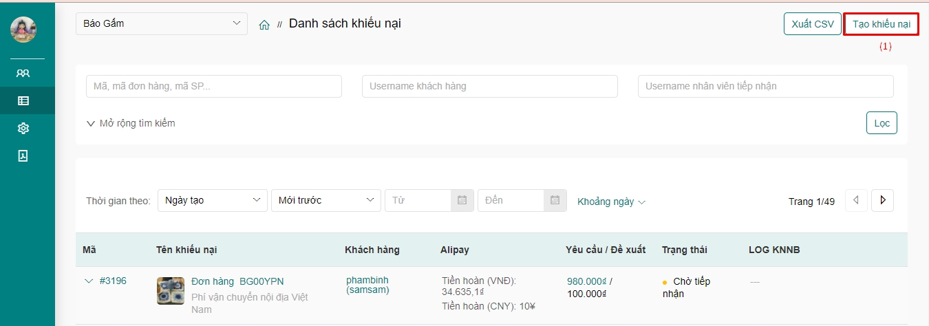 Mục đích: Chức năng này cho phép quý khách có thể tạo khiếu nại dịch vụ cho toàn bộ đơn hàng hoặc tạo riêng cho các mã sản phẩm trên đơn.