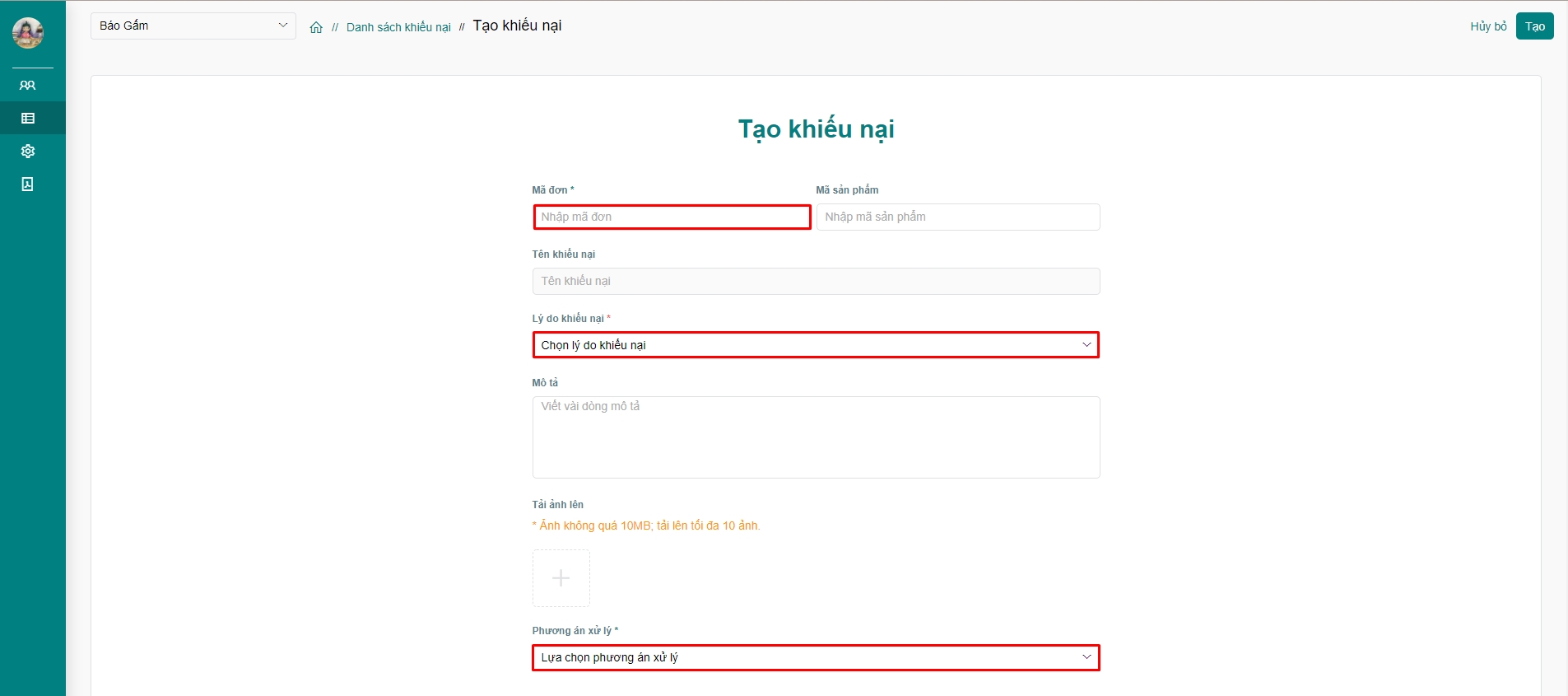 Bước 2: Tại màn hình Tạo khiếu nại, quý khách nhập đầy đủ các thông tin bắt buộc (*) để tạo khiếu nại như: mã đơn, lý do khiếu nại, phương án xử lý: