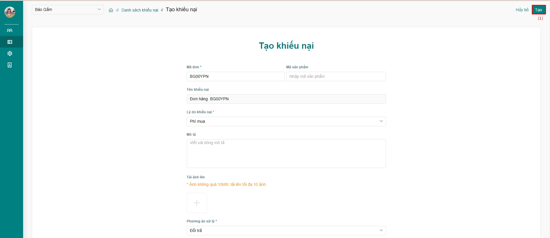 Bước 3: Sau khi nhập đầy đủ thông tin, quý khách bấm chọn nút (1) "Tạo" để tạo khiếu nại: