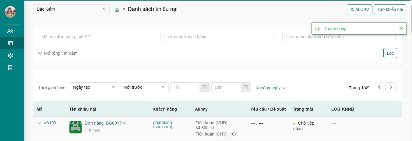 Sau khi tạo khiếu nại thành công, hệ thống sẽ hiển thị thông báo "Thành công" và chuyển hướng tới màn hình danh sách khiếu nại, tại đây sẽ hiển thị các thông tin của khiếu nại đã được tạo: