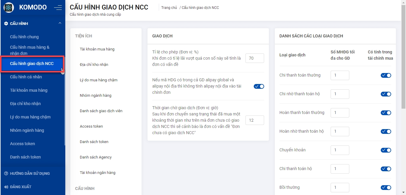 Quản lý truy cập trang Cấu hình từ menu bên trái, chọn Cấu hình Giao dịch NCC.
