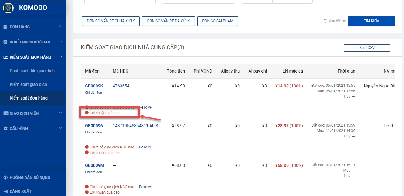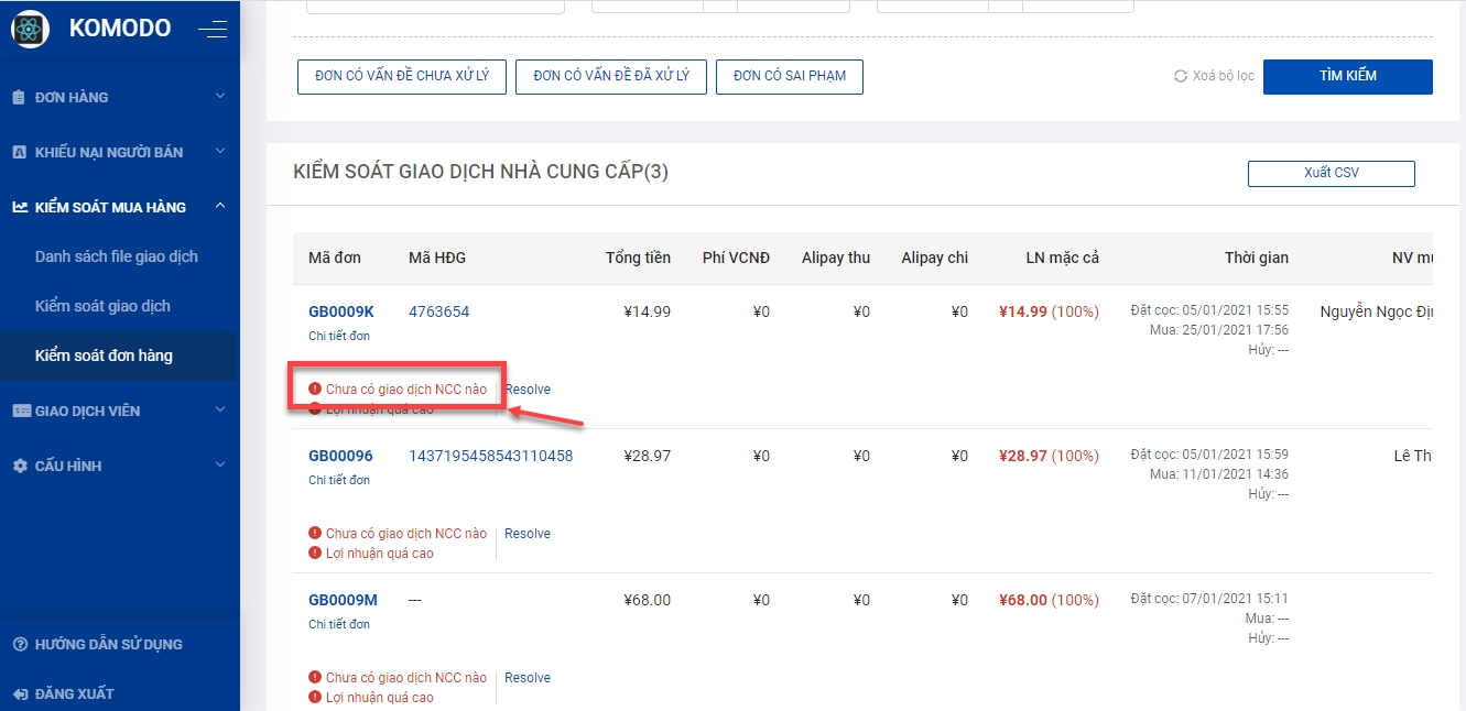 Sau khi đơn chuyển sang trạng thái đã mua một khoảng thời gian như cấu hình mà đơn chưa có giao dịch NCC thì sẽ cảnh báo là đơn có vấn đề "Đơn chưa có giao dịch NCC"